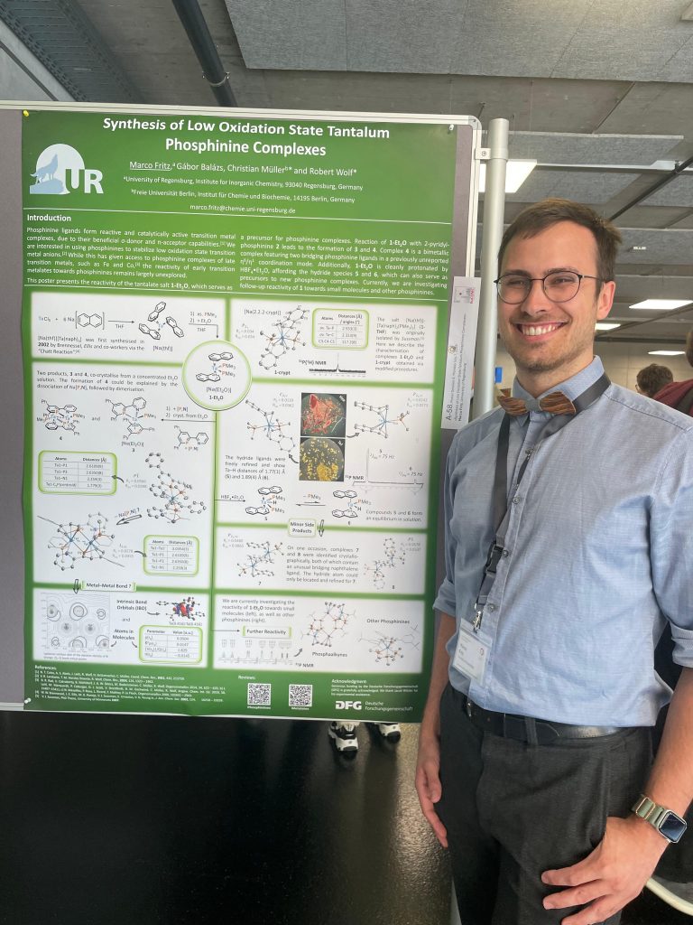 Feb 26th: In the end of February the Wolf Group was represented at the KCT in Innsbruck by Marco, who gave a great talk on ‘Heterobimetallic Activation of White Phosphorus by Co-Zn Complexes: Access to P4-Sandwich Compounds’ and by Franzi and Alex, who were presenting excellent Posters on their research! Cheers to all of them!